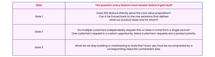 The discipline required is to treat every feature request as the beginning of an investigation, not the beginning of a sprint. What problem does this request represent? Is that a problem that belongs inside the product? Does solving it for this customer make the product better for everyone, or just for them?