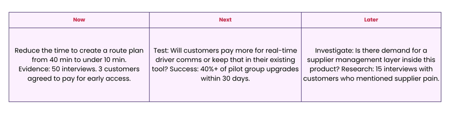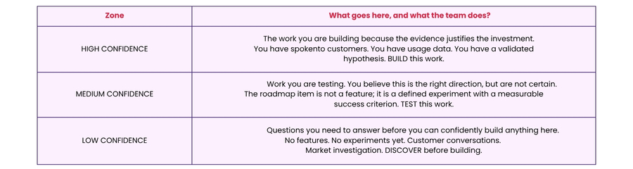 Notice what this roadmap does not contain: a launch date, a feature list for Q3, or anything in “later” disconnected from a specific learning question. What it does contain is a clear picture of where the team is confident and why, where they are testing and how they will know if the test succeeds, and where they are still discovering.